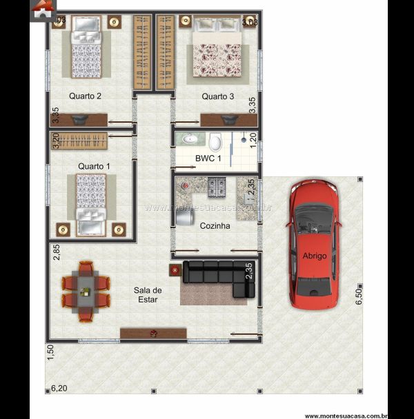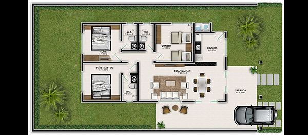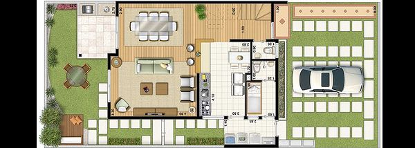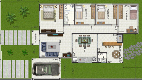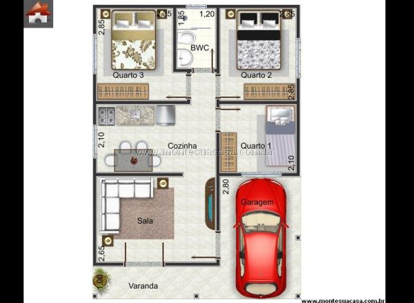 O projeto com garagem para casa pequena pode ter ainda vaga para dois ou até três carros, dependendo do tamanho do terreno. A parte da frente do lote pode ser destinada totalmente para a garagem, para famílias que possuem vários carros. O restante do terreno pode ser usado também totalmente para acomodar todos os cômodos da casa que seja mais condizente com o número de moradores.