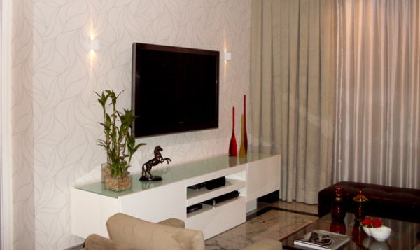 E para aproveitar todo o espaço de sua sala, invista em estantes altas ou em prateleiras fixadas na parede, para você posicionar seus aparelhos eletrônicos e também outros objetos, como livros, revistas e também objetos de decoração.