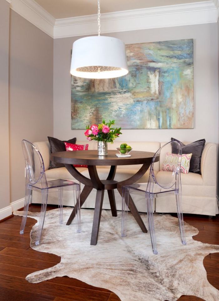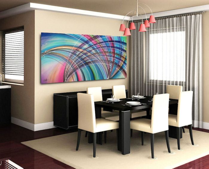 O quadro decorativo para a sala de jantar com estilo abstrato deixa o ambiente misterioso e propício para refeições especiais.