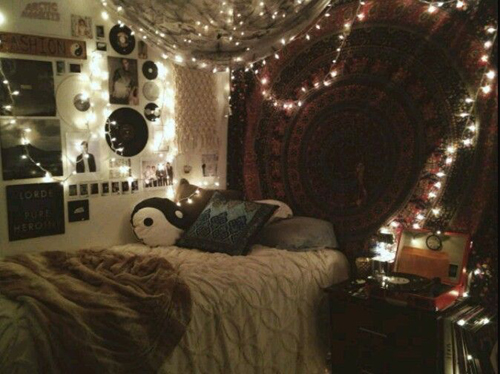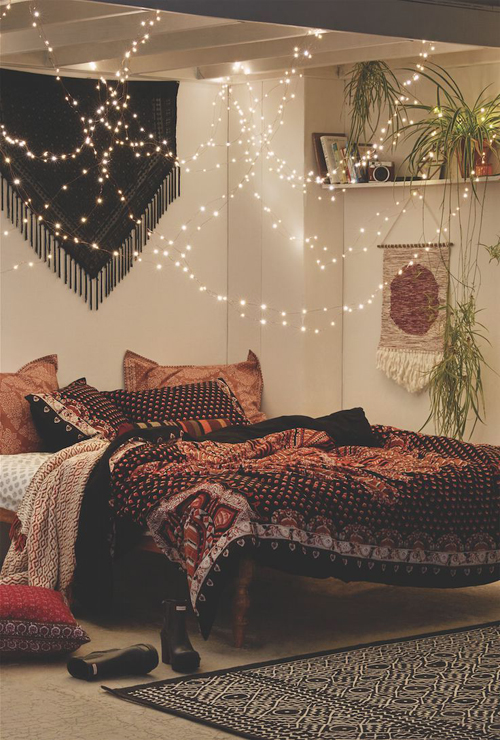 Aposte em elementos diferenciados e até mesmo sofisticados, para deixar o seu quarto hippie mais chic e interessante. O pisca-pisca, além de deixar o quarto com iluminação diferenciada, ainda deixa o estilo hippie mais sofisticado.