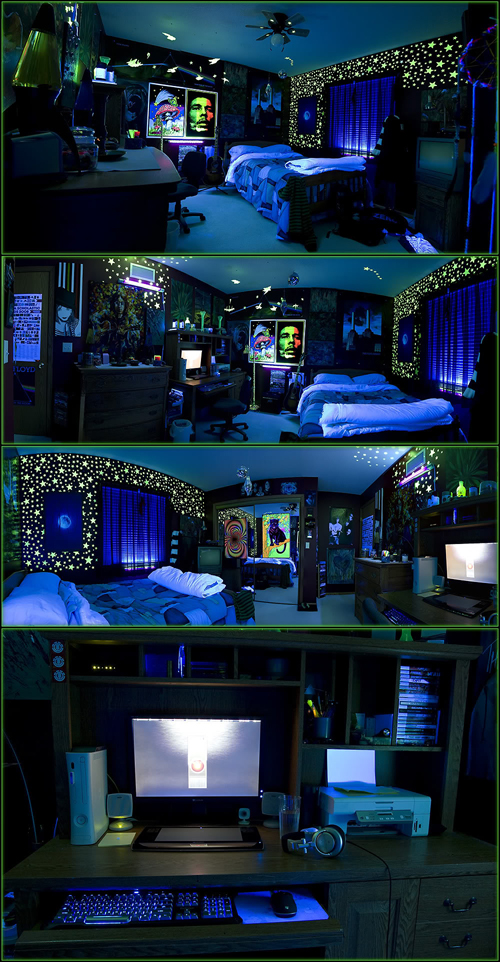 Tinta neon ou fluorescente pode ser um belo norte, para você que não sabe por onde começar a criar o seu quarto com estilo psicodélico. Movimentos oscilantes com as tintas e objetos fluorescentes garantem os efeitos necessários para criar um quarto com este interessante estilo.
