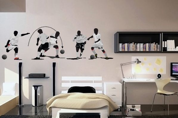 Outra alternativa bem barata para aderir à decoração de quarto com o tema futebol é investir em adesivos com desenhos de jogadores, bolas ou qualquer outro ícone do futebol. E você pode posicionar estes adesivos em qualquer lugar, na cabeceira de sua cama, sobre uma escrivaninha ou em móveis, como o guarda-roupa.