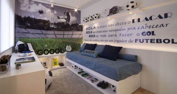 Se você quiser apostar em somente algum item relativo ao futebol para a decoração de seu quarto você pode aderir ao painel de futebol, que pode conter imagens de campo de futebol, imagens de jogadores de futebol ou ainda cores e símbolos do seu time preferido.