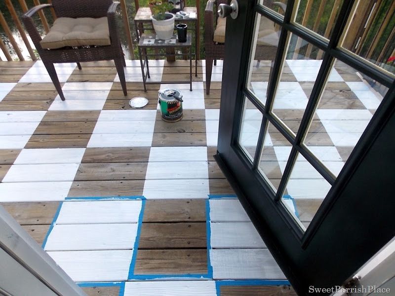Siga refazendo a decoração do deck de madeira de seu lar pintando mais quadrados até chegar ao final das fileiras. Retire todos os pedaços de fita adesiva.