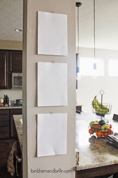 Agora, corte o papel com o mesmo formato e tamanho das placas de madeira e fixe na parede onde você vai fixar as peças de madeira, com o auxílio e pedaços de fita adesiva. E verifique se está da maneira que você quer que fiquem as suas placas de madeira.