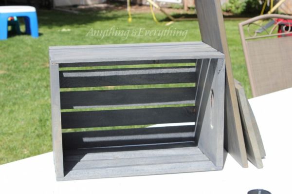 Comece serrando os pedaços de madeira com tamanho suficiente para fazer um “X” dentro da caixa de madeira escolhida. Depois lixe todas as partes de madeira, com o auxílio da lixa. E então, pinte a caixa de madeira, por dentro e por fora, e pinte também os pedaços de madeira, com o auxílio do pincel e cor de tinta para madeira que você quiser.