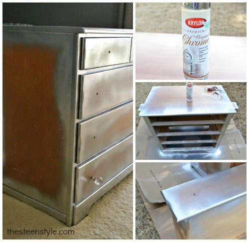 Comece retirando os puxadores das gavetas de sua cômoda pequena, com o auxílio de uma ferramenta específica.  Depois forre o local onde você vai pintar a sua peça com jornal velho, papel velho, papelão ou plástico. E com o auxílio da tinta em spray prata espelhada pinte toda a sua cômoda pequena. E se você não quiser gastar muita tinta, reforce a pintura apenas nos cantos das partes de sua cômoda pequena e nas partes pequenas onde não irão receber os pedaços de espelho. E deixe a tinta secar muito bem antes de manusear novamente a sua peça e continuar com a confecção de seu trabalho.