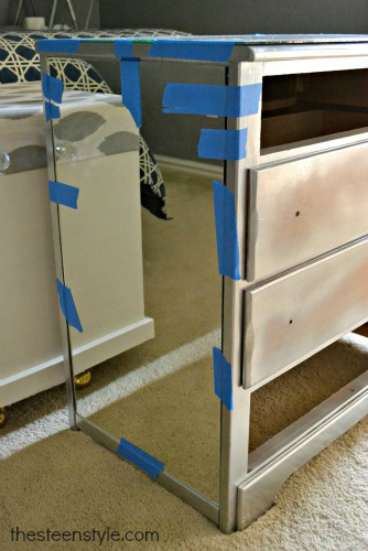 Logo após, para que as partes de espelho sejam coladas perfeitamente e fiquem bem firmes em sua cômoda pequena, posicione pedaços de fita adesiva pela parte que acabou de ser colada.
