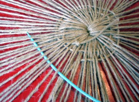 Logo após, assim que você tiver revestido todo o assento com os fios, amarre outro fio no centro e comece a trançar por cima e por baixo, com o auxílio da agulha de plástico grande, entre os fios já fixados no assento.