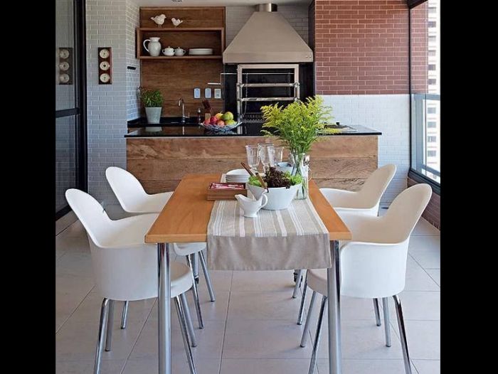 Varandas gourmet em casas pequenas podem ser conseguidas com você investindo em churrasqueira e fogareiros também pequenos. A mesa pode ser substituída por apenas bancos ou cadeiras e uma prateleira fixada na parede.  O mesmo vale para varandas gourmet em apartamentos pequenos.